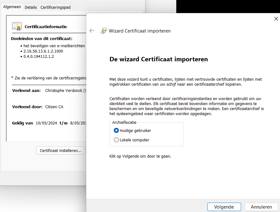 Vervolgens Certificaat Installeren -> huidige gebruiker -> volgende -> automatisch selecteren -> volgende -> voltooien