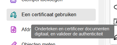 Ga naar alle tools -> meer weergeven -> een certificaat gebruiken -> Digitaal ondertekenen