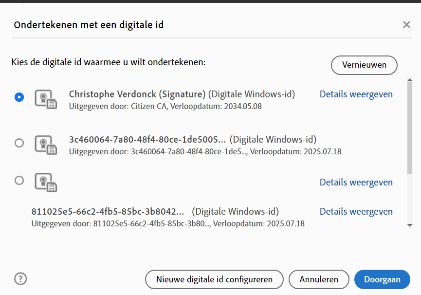 Trek een kader waar je de handtekening wil plaatsen -> kies je Citizen (Signature) certificaat. ->doorgaan -> ondertekenen