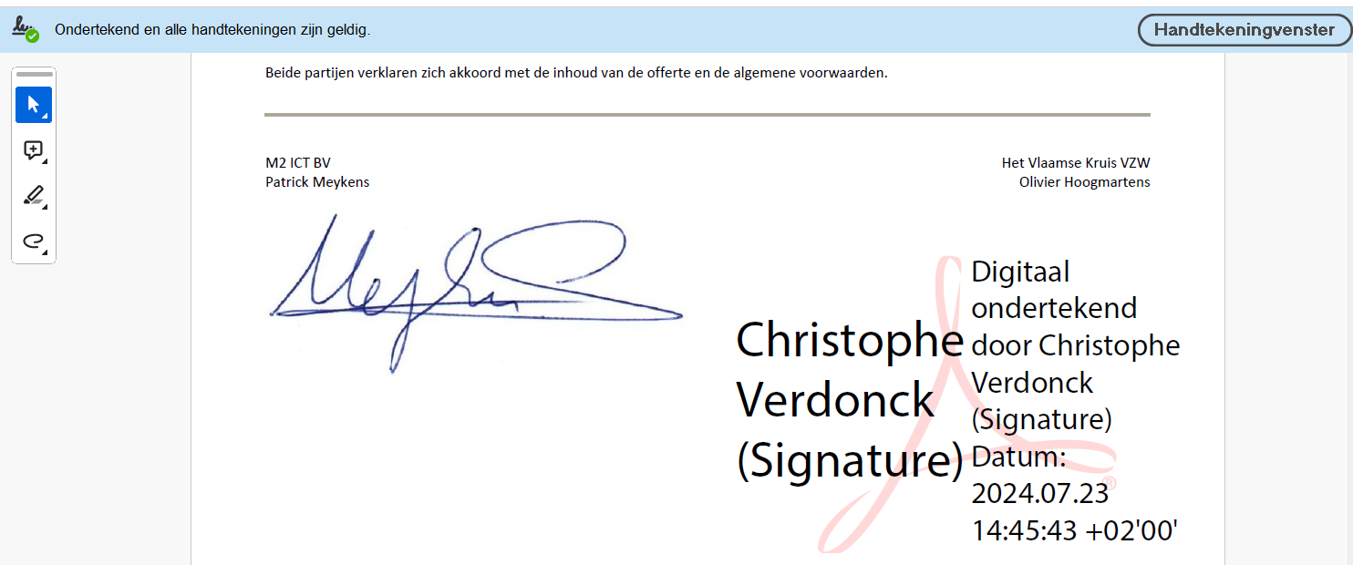 soms kan het zijn de acrobat aangeeft dat de handtekening niet geldig is. sluit dan de ondertekende pdf en open deze opnieuw. normaal moet deze dan aangeven dat deze wel geldig is.