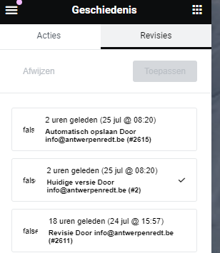 Indien dit niet helpt er er vermoedelijk een wijziging gebeurt via 'Bewerken' ipv 'Bewerk met Elementor'