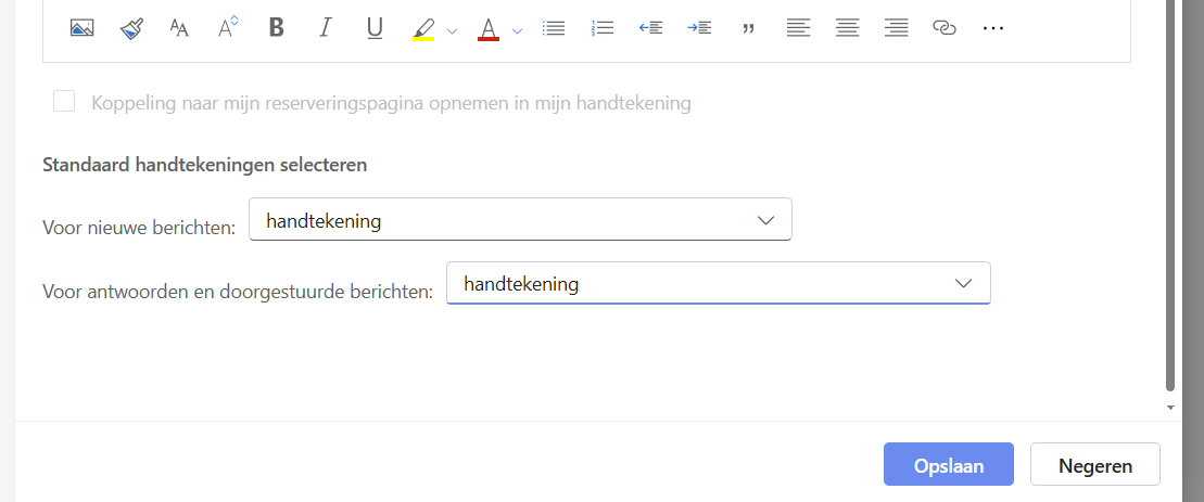 Stel vervolgens de handtekening in voor nieuwe en doorgestuurde berichten in en klik nogmaals op opslaan.